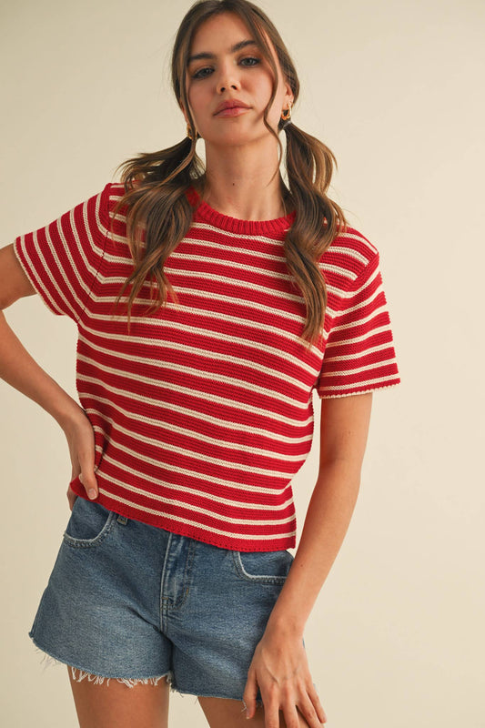 SHORT SLEEVE STRIPED SWEATER TOP Red Stripe